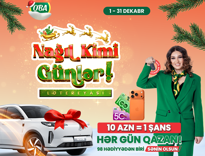 OBA ilə hər gün qazanmaq şansın var. Belə ki, 1-31 dekabr tarixlərində hər gün 3 qalib müvafiq olaraq 50, 50 və 100 AZN-lik OBA bonus kartı, hər həftə 1 qalib iphone 17 pro, qazanacaq! Böyük tirajda isə sizi 1 ədəd 2025-ci il Changan Qiyuan Q05 gözləyir! Odur ki siz də loteryada iştirak edin, qaliblər siyahısında olun!