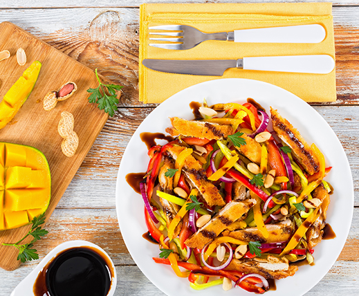 Toyuq filesi qaynadılır və didilir. Sarı, yaşıl və qırmızı bibərlər kub şəklində doğranılır və üzərinə file əlavə edilir. Üzərinə zeytun yağı, narşərab, duz və istiot əlavə edib servis edirik. Nuş olsun!