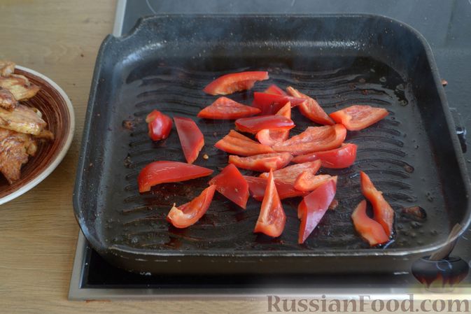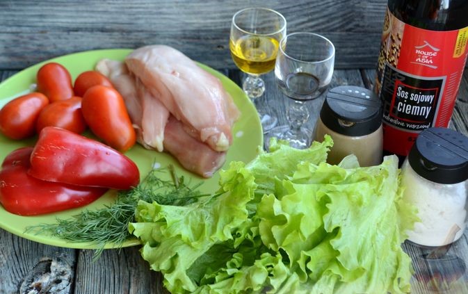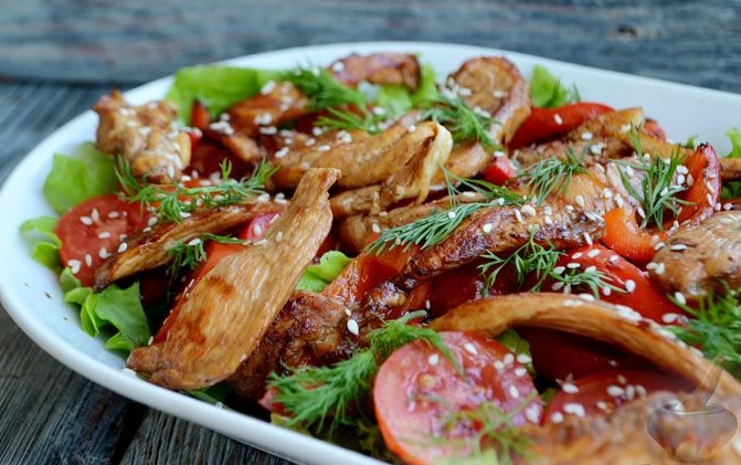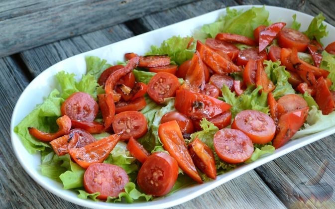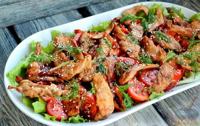 Toyuq, bolqar bibəri və pomidor ilə isti salat