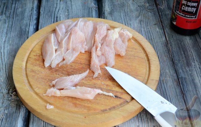 Kəskin bıçaqdan istifadə edərək toyuq filesi təxminən 5-7 mm qalınlığında nazik dilimlərə kəsin.