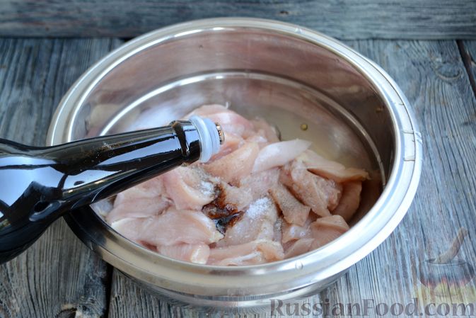 Toyuq filesini bir qaba qoyun. Duz, qara bibər və soya sousu əlavə edin. Qarışdırın. Toyuğu 10-20 dəqiqə marinat üçün buraxın.