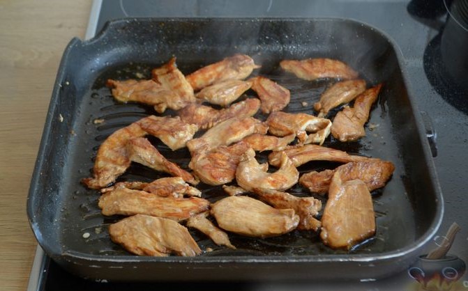 Marine edilmiş toyuq filesi zeytun yağında bir tərəfdən qızarana qədər təxminən 5-7 dəqiqə qızardın, sonra toyuq parçalarını çevirin və 5 dəqiqə daha qızartmağa davam edin.