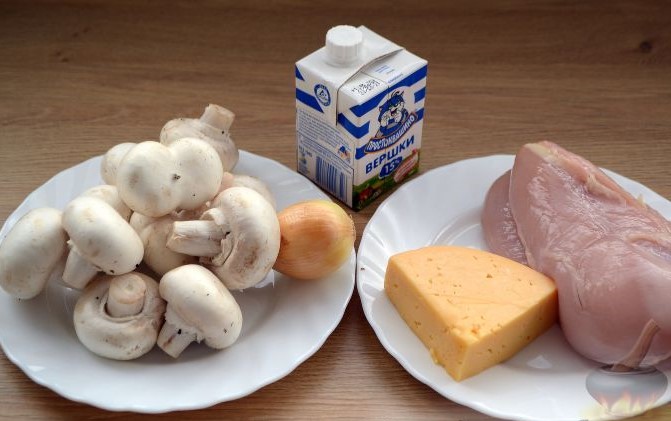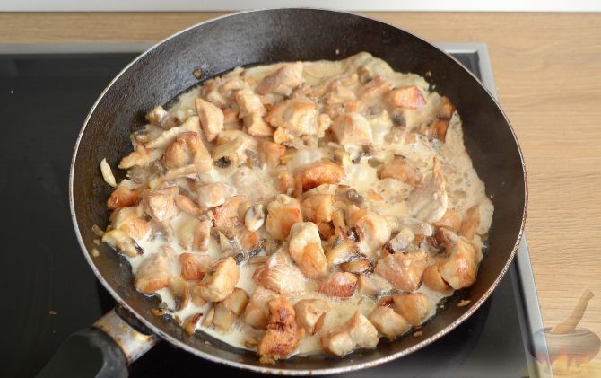 Şampinyonları qaba doğrayın və tavaya əlavə edin. Göbələklərdən gələn rütubət buxarlandıqdan sonra duz, istiot və soğanı və göbələklə toyuğu qızıl qəhvəyi olana qədər 5-7 dəqiqə bişirin. Ət və göbələklərin üzərinə krem tökün, hər şeyi birlikdə qovurun.