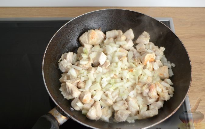Toyuq filesini xırda doğrayın və bitki yağı ilə bir neçə dəqiqə bişənə qədər qovurun. Soğanı xırda doğrayın, toyuğa əlavə edin və toyuq filesini soğanla daha 3-4 dəqiqə qovurun.