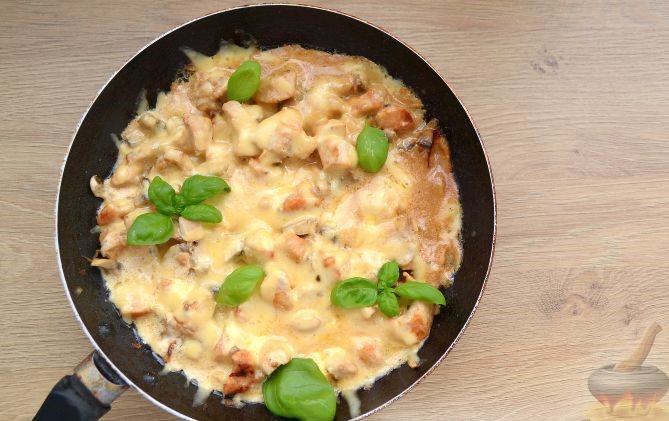 Pendiri qaba bir sürtgəcdən keçirib üstünə səpin. Qazanın altını söndürün və tavanı qapaqla örtün. Pendir 3-5 dəqiqədə əridildikdə, göbələk və toyuq ilə süfrəyə verilə bilər, tavanız icazə verərsə, julieni reyhan yarpaqları ilə bəzəyin.